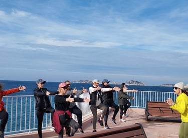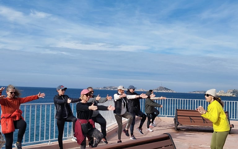 Cours hebdomadaires ; Marche, cours de Yoga et de Pilates chaque samedi matin, en plein air ou dans une salle au bord de la plage